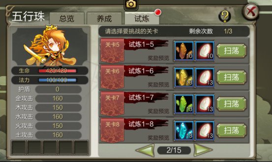 遇到药水,特点又分两种附加特点直接加成到人物本身,试炼特点为在五行试炼关卡中的特点。金木水火土五颗神珠可消耗相同特点结晶进行特点战力提高。