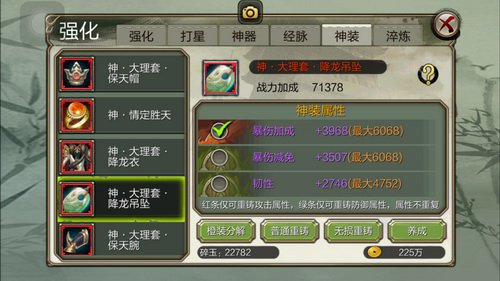 培育是神装体系中费时吃力的地方了。培育的作用就是把白色特点升级到橙色,碎玉、五行石是必要的耗费品,雁门关有掉落。白色到绿色:如同一共大约只需要20个左右的一级五行石。