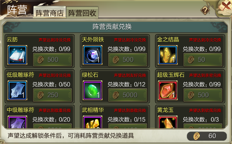 阵营商铺:阵营商铺的道具兑换需求威望达到方针阶段来解锁,解锁后可经过耗费阵营奉献来兑换道具,赛季内每个道具有兑换次数上限,请您合理分配阵营奉献。 阵营收回:某些体系达到方针战力后,可出售相应的道具来兑换威望值,每日出售取得的威望有上限的哦,达到上限后无需再进行出售。