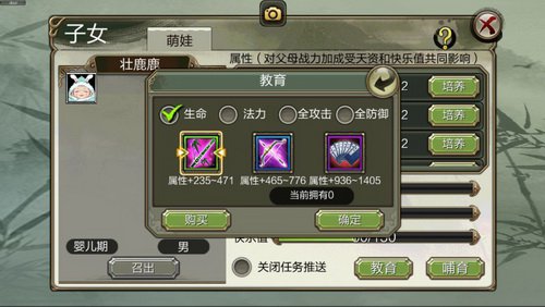 从道具店中少侠们能够获得专用的教育道具,在子女界面,点击教育,便能够教给宝宝常识啦。每次耗费的道具能够提高宝宝的生命,法力,全进犯和全防御中的一项,不同质量的道具能给宝宝带来的提高也是不相同的。