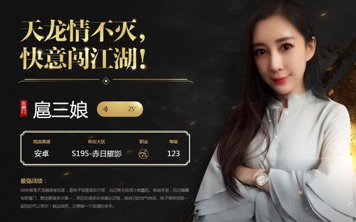 懷著對天龍江湖的熱情來到天龍3D,端遊積攢的多年經歷協助她快速成為天龍3D壹名實力佼佼者,屢次群龍聚首的第壹名就是最好的依據,作為四名代言人中僅有壹名男性。