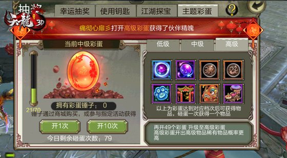 主題彩蛋總共分為初級、中極、高檔三種,可以經過屢次砸取晉級彩蛋。彩蛋等級越高獎賞也越豐厚。初級彩蛋可以獲取白色、綠色精魄、升星丹、四聖象系列等道具。